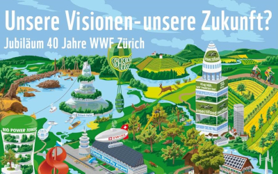 Zu seinem 40-jährigen Bestehen stellt sich der WWF Zürich die Frage, wie der Kanton in weiteren vier Jahrzehnten aussehen könnte. Es entsteht das Jubiläumsposter von Adrian Tobler mit Insektenfarmen, Turmgärten und Tauschbörsen in der Stadt, mit frei fliessenden Flüssen sowie einer vielfältigen, naturnahen Kulturlandschaft. Nicht alles ist wörtlich zu nehmen – und doch zeigen die Illustrationen, wie viele Möglichkeiten wir haben, unsere Zukunft nachhaltig, lebenswert und liebenswert zu gestalten. Diese Visionen sollen uns in den kommenden Jahren begleiten und inspirieren.